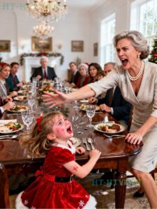 I will never forget the sound my mother-in-law’s hand made when it struck my five-year-old daughter’s face at Christmas dinner. It wasn’t just the impact — it was the sharp, cracking echo that bounced off crystal glasses and polished wood like something breaking that could never be repaired. What I remember most is that no one screamed, no one stood, no one rushed over — they kept chewing.