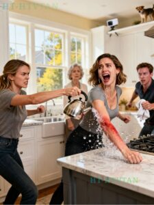 Without hesitation, she swung the kettle, its lid already open, straight toward me. The boiling water arked through the air and crashed onto my left arm and chest. My scream shook the kitchen. Immediately after, Allison slammed the empty kettle onto the counter with a loud metallic clang. The moment my scream echoed into the living room, the music and conversations ceased instantly.