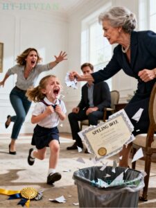 The sound was sharp, final. She tore it again and again, each rip deliberate, each motion calculated, until the certificate was nothing more than scraps. She dropped them into the trash like they were worthless. Emma’s sob broke through the room, high and desperate, as she cried about how hard she’d worked, how proud she’d been.
