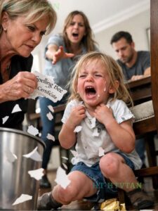 Brenda took the certificate like it was something unpleasant, holding it at arm’s length. She studied it with exaggerated scrutiny before curling her lip and saying something about children buying love with attention. The words landed hard. Emma’s face fell, confusion flooding her expression as tears welled in her eyes.
