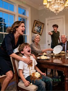 She reached across the table for Liam’s plate, his halfeaten roast beef and potatoes, and in one sharp, deliberate motion, she turned it over. The food slid slowly down the front of his shirt, gravy dripping in thick trails, potatoes clinging to his chest, bits of green beans tumbling into his lap. The movement was not rushed. It was slow, almost calculated.