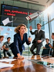 Inside the glass conference room, executives stared at frozen screens as error messages replaced financial projections.