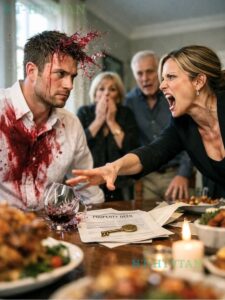 At dinner, my sister dumped wine on me and screamed, “You have until sunrise to get out of my house.” That was how she chose to do it. Not quietly. Not privately. Not with even the smallest attempt at dignity. She waited until everyone was seated, until the food was passed around, until the room was full of clinking silverware and forced laughter and the thick, familiar smell of roasted turkey. Thanksgiving dinner, the one day a year we were all expected to pretend we were a functional family, became the stage she’d clearly been rehearsing on in her head for weeks.