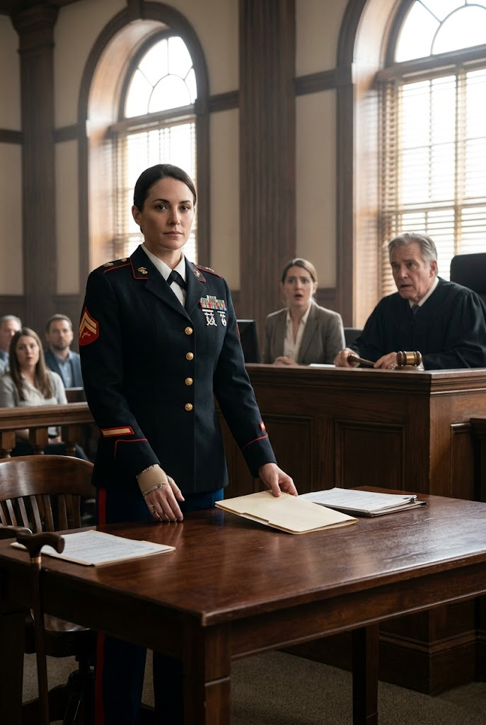 A Disabled Marine Walked Into Court Wearing the Navy Cross She Earned in Combat—But the Judge Took One Look at the Medal on Her Chest and Ordered Her to Remove It in Front of Everyone. What Happened Next Froze the Entire Room, Exposed a Dangerous Abuse of Power, and Set Off the Chain of Events That Destroyed His Career. Before the day was over, a grieving mother, a dead Marine’s widow, and one quiet folder of official documents would reveal exactly who had real honor—and who never deserved the bench.