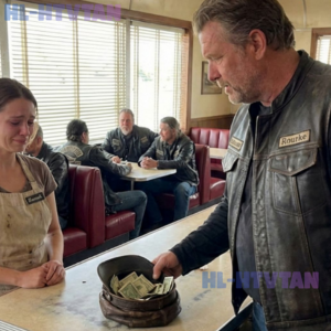 At the front of the group walked a man who didn’t hurry and didn’t need to—tall, broad-shouldered, with a calm that sat on him the way a well-fitted jacket does, worn in rather than put on for show. He removed his sunglasses first, slow and unbothered, and let his eyes sweep the diner like he was taking inventory of a place he might have to remember later, and that alone did something strange to the air, because people could tell when they were being sized up and people could also tell when that sizing up wasn’t meant to threaten them. His name was Landon “Lance” Rourke, and the name fit him in the blunt, American way nicknames often do—earned, repeated, stuck like a patch stitched on for good. He didn’t carry himself like a man looking to start trouble, but trouble would have recognized him anyway, the way a stray dog recognizes a man who’s been in fights. Behind him, the rest of his crew followed his lead, bandanas coming off, gloves tugged free, dust shaken from sleeves even though the sky outside was clear and blue, and there was something about them that made it obvious they were used to moving together—no bumping shoulders, no uncertainty about where to stand, no nervous chatter to fill space. They weren’t here to scare anybody, not today, not on a day like this, a day that still clung to them in the small signs of fatigue around their eyes and the loosened, relieved way they carried themselves, the aftermath of a long ride and a good deed. They’d just dropped off thousands of dollars’ worth of school supplies to a reservation up north, and there was a particular kind of exhaustion that comes after you’ve done something that feels clean, something that doesn’t leave a sour taste afterward, and that tiredness seemed to settle over them now like dust that finally had a place to land. Before the room could build its own story about who they were and why they’d come, Lance spoke, and his voice moved through the diner with a steadiness that seemed to reach people before the words did. “We’ll take the back booths,” he said, not asking permission but not taking anything either, and then, like he was giving the whole place a simple script to follow, he added, “Coffee all around.” Simple requests said in a measured tone have a way of disarming a crowd that’s already halfway to fear, and you could almost feel shoulders lowering, hands returning to menus, forks resuming their slow, careful journeys.
