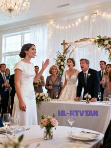 Conversations stopped mid-sentence. Silverware paused halfway to mouths. Even the soft violin music drifting from the reception speakers seemed to fade into the background as every head slowly turned toward me.