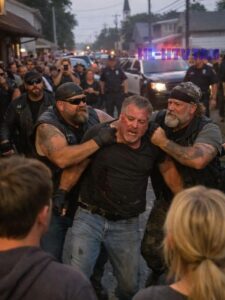It hit Douglas Whitmore’s face like a spotlight, bleaching the smugness out of him as the leather-clad man guided him through the doorway and onto the front stoop. The sound of the motorcycles idling in formation wasn’t chaos—it was pressure. A low, steady vibration that made the glass in the tavern windows hum.