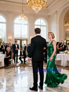 Elena wore an emerald-green gown that shimmered under the chandeliers with every step she took.
