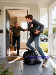 The moment he saw me standing on the porch with trash bags full of my belongings, his face softened with concern.