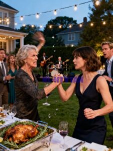Mark turned at last, confusion spreading across his face as he took in the frozen tableau: his mother’s raised arm, his wife’s firm grip, the circle of guests watching as though witnessing something sacred and forbidden.