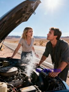 I laughed bitterly. Call AAA. As if that would magically teleport a tow truck through the desert heat. Sam wiped his hands on his jeans, leaving dark streaks across the fabric. “Okay, new plan,” he said. “I think I can jury-rig something with the spare hose from the windshield washer system. Not ideal, but it might get us to the next town.”