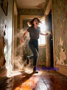 The hallway at the end of the second floor was narrow, the kind of space that smelled faintly of dust and neglect. Light barely touched it, slipping through the edges of the staircase window. At the very end, a closet waited, its handle loose, swinging slightly when the door nudged it. I slipped inside, the hinges creaking softly under my weight, and crouched behind a jumble of coats, expecting the dull silence of an empty hallway.
