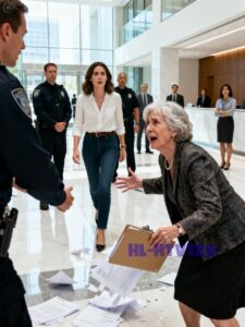 Clutching a manila folder so tightly it crumples slightly under her grip, like it’s the only thing holding her together. Her shoulders are hunched forward, her posture rigid, but her voice—her voice is loud enough to echo off the polished floors and glass walls.