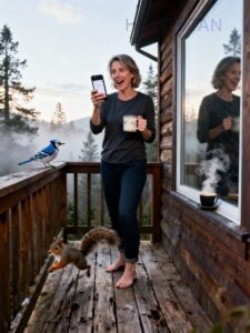She stood barefoot on creaky pine boards, blinking at her phone while steam curled from her cup.