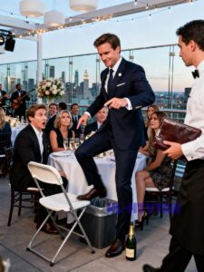 When the doors opened, the rooftop hit me like a scene from a movie. String lights hung overhead, warm and golden, the kind that makes every face look softer than it really is. Floral centerpieces sat on the tables, perfectly arranged, and a small jazz band played in the corner like they’d been hired to smooth every awkward pause.