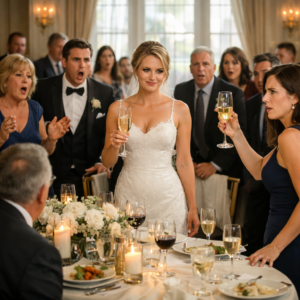 Jessica swirled the glass gently, watching the powder dissolve into the pale gold like a secret vanishing in plain sight. She set the flute down with care—too much care—and smoothed her dress, as if she’d merely adjusted a napkin. Then she walked away, her lips curling into a smile that wasn’t joy and wasn’t even cruelty.