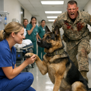 The dog exploded into sharp, violent barks, yanking the leash hard enough to jerk the gurney and force the medics to stop or risk dumping the patient on the floor. A resident stumbled back, palm up instinctively. Security began to move, hands hovering near tools that never helped in the face of a working dog determined to do something.