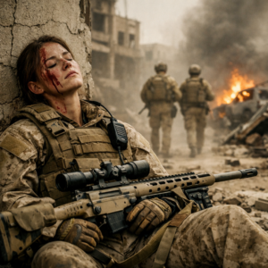 It wasn’t a blast that threw her. It was a hit that drove itself into her body. A sharp, impossible sensation, like someone had shoved a railroad spike through her abdomen. The shrapnel entered just under her ribs, angled down, and exited through the outer meat of her thigh. She felt the impact in her bones before the pain arrived.