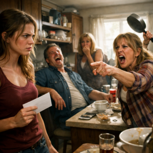 She turned fully, skillet still in her hand. Grease popped behind her. “Don’t play stupid with me,” she snapped. “Your paycheck. It’s the first of the month. You know the rules.”