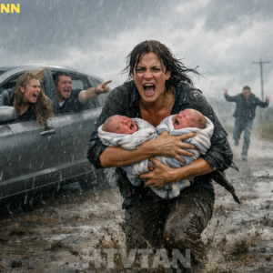 I stumbled into the ditch, hands shaking, grabbing Emma first, checking her face, her breathing. She was screaming but alive, protected by the car seat. Lucas was awake now too, both babies wailing as if the storm had entered their bodies.