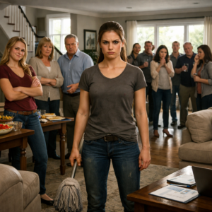 She stared past my shoulder, at the row of ten guests seated around the table—neighbors, church friends, a couple from Dad’s old office—her face set in a pleasant, brittle smile like this was all perfectly reasonable.
