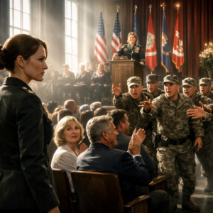 I stood in the narrow shadow behind the stage curtain, the kind of shadow you only notice when you’re trying not to be seen. The auditorium was packed—five hundred people, maybe more—polished floors, flags spaced perfectly, officers in dress uniforms sitting so straight it looked painful. The air smelled like floor wax mixed with cheap cologne and expensive perfume. This was supposed to be a night about honor.