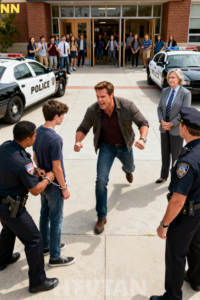 Two patrol cars sat at odd angles near the curb, blue and red lights strobing against the pale brick. A few teachers hovered on the steps, their faces composed in that tight, neutral way adults get when they’re pretending the world still makes sense.