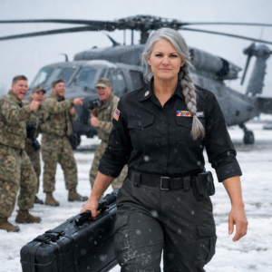 She wasn’t young. Late fifties, tall, fit in a way that came from discipline instead of vanity. Silver hair was pulled into a clean braid tucked under her cap. Her face was lined but striking—sharp cheekbones, steady mouth, eyes the color of cold steel. She carried two heavy duffels across broad shoulders as if weight was just another constant. In her right hand, she held a black rifle case, the kind you didn’t swing around carelessly. It looked welded to her grip.