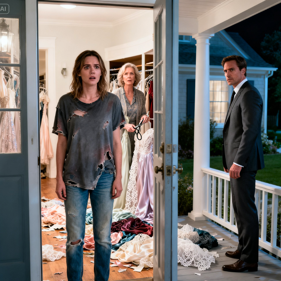 THE NIGHT BEFORE MY BROTHER’S WEDDING, MY MOTHER STOOD IN THE HALLWAY AND CUT UP HALF MY WARDROBE LIKE SHE WAS PRUNING A THING SHE HOPED WOULD NEVER GROW. SILK. CHIFFON. LACE. EVERY DRESS I’D BOUGHT WITH DOUBLE SHIFTS, MISSED MEALS, AND THE KIND OF QUIET SELF-RESPECT MY FAMILY HATED SEEING ON ME. THEN THE DOORBELL RANG. I OPENED IT IN A RUINED T-SHIRT AND FADED JEANS—AND FOUND MY SECRET HUSBAND STANDING ON THE PORCH IN A CHARCOAL SUIT, STARING PAST ME AT THE LIFE I’D BEEN FORCED TO SHRINK INSIDE….