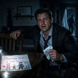On the dining table sat a single piece of paper, crooked and bright against the dark wood. A child’s drawing. Crayon lines. Uneven letters.