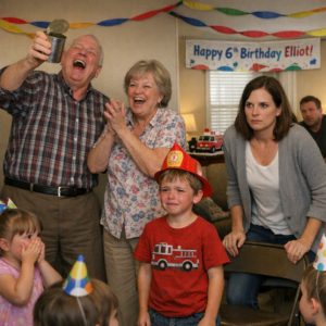 Elliot stood in the middle of my living room in a plastic firefighter helmet two sizes too big, cheeks flushed from sugar and excitement, his little chest puffed out like he’d been waiting for this moment since he woke up at dawn. Eight kids in paper hats crowded around him, their parents lining the walls with phones half-raised, ready for the cute “birthday reaction” video.