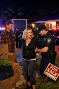 Five patrol cars screamed into Willowbrook like we were hosting a hostage situation. Blue and red lights stuttered across my siding, my windows, my dying vegetable beds. Doors flew open. Officers fanned out behind their vehicles. Hands hovered near holsters. A megaphone cracked the night open like thunder.