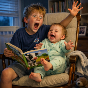 I kept reading, stunned, watching him stare like he was studying my face. My breathing slowed. The rocking chair creaked. The story moved forward, and Liam stayed calm.