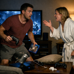I was in the basement of my little house—the one I still couldn’t believe was mine—sitting on a folding chair that had seen better days, controller warm in my hands, the TV throwing blue light across concrete walls. Upstairs, the pipes groaned the way they always did when the shower ran, like the house was clearing its throat to remind me it was old and stubborn and alive.