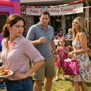 My backyard was a tornado of six-year-olds and pastel chaos: a bounce house wheezing in the corner, a unicorn balloon trying to escape the laws of physics, pizza grease already shining on paper plates. My sister Amanda was halfway through her third “PLEASE DO NOT LICK THE CUPCAKES” of the day. I was at the snack table lining up fruit like it mattered.