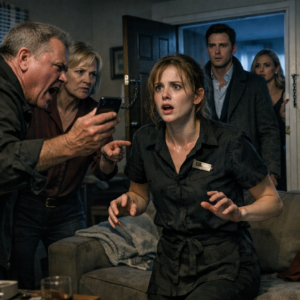 Her eyes flicked toward the dining room behind her, where people were laughing. I caught a glimpse of Hailey in a deep green dress, hair curled, wine glass lifted like she was already mid-toast. I saw my dad’s shoulders, hunched at the head of the table like the king of a castle.