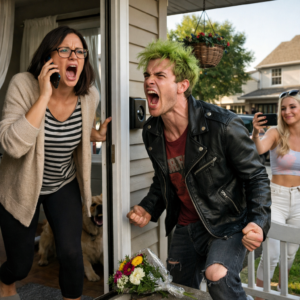 I stood frozen in my hallway, barefoot, clutching my phone so hard my fingers ached. My porch light flickered across the peephole lens as the man leaned into it, green hair glowing like a traffic light gone wrong.