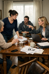 “Dad’s estate is complicated,” she said, flipping it open like a judge reading charges. “Medical bills, outstanding debts, the mortgage. We’re looking at roughly three hundred and forty thousand in obligations.”