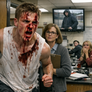 This was the kind of blood that keeps coming—dark and thick, pouring from his nose, dripping off his chin, threading down his neck and into the torn white of his practice jersey like ink soaking paper. One eye was ballooned almost shut. The gash above his eyebrow was split open like somebody had tried to peel his forehead back. His hands shook when he tried to brace against a lab table, and the sound he made wasn’t a curse or a shout.