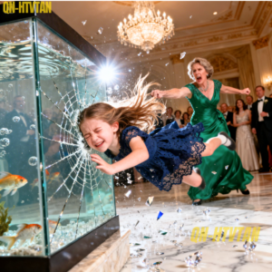 The glass shattered. Water exploded outward, drenching the floor. The sound was deafening—a thousand sharp fragments cascading onto marble as silver fish flopped helplessly in the wreckage. Lydia screamed, collapsing into the shards. Her dress darkened as blood began to spread through the soaked fabric.