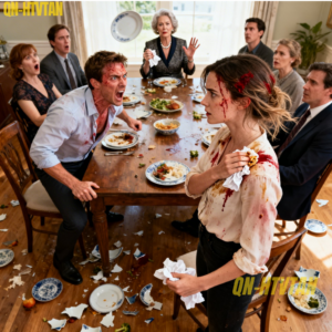 Porcelain exploded against Nina’s head. A sharp sting, then warmth sliding down near her hairline. Bits of chicken and sauce clung to her shoulder. Someone gasped. Someone else laughed nervously, as if it couldn’t be real.