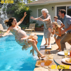 One second, I was standing near the edge of my in-laws’ backyard pool with one hand resting over my stomach, trying to ignore the tension that had been building all afternoon. The next, the world tilted. My heels slipped on the wet stone, and I crashed backward into the cold water in front of nearly twenty people.