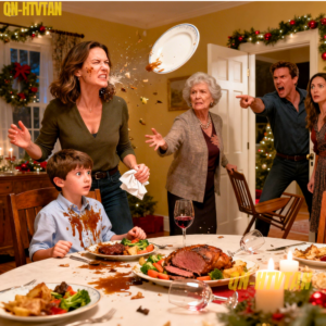 The room went utterly still. No one moved. No one spoke. The only sounds were the soft plop of food hitting fabric, the faint drip of gravy onto the tablecloth, and the distant murmur of the TV countdown in the background. Liam froze, eyes wide, hands hovering above the mess. I felt his small body tense beside me, his breath catch.
