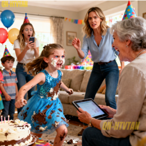 The party was loud and bright until my sister grabbed the cake and smashed it into my daughter’s face, shouting surprise as crumbs and frosting splattered the table. My mom laughed so hard she had to hold her stomach, and the adults around her smiled like they didn’t want to be the only one who disapproved. My daughter wiped her eyes slowly, breathing through her nose, completely still like she was holding something back. Then she looked up at me and said she wanted to show everyone the present, and every grin around the room vanished instantly.